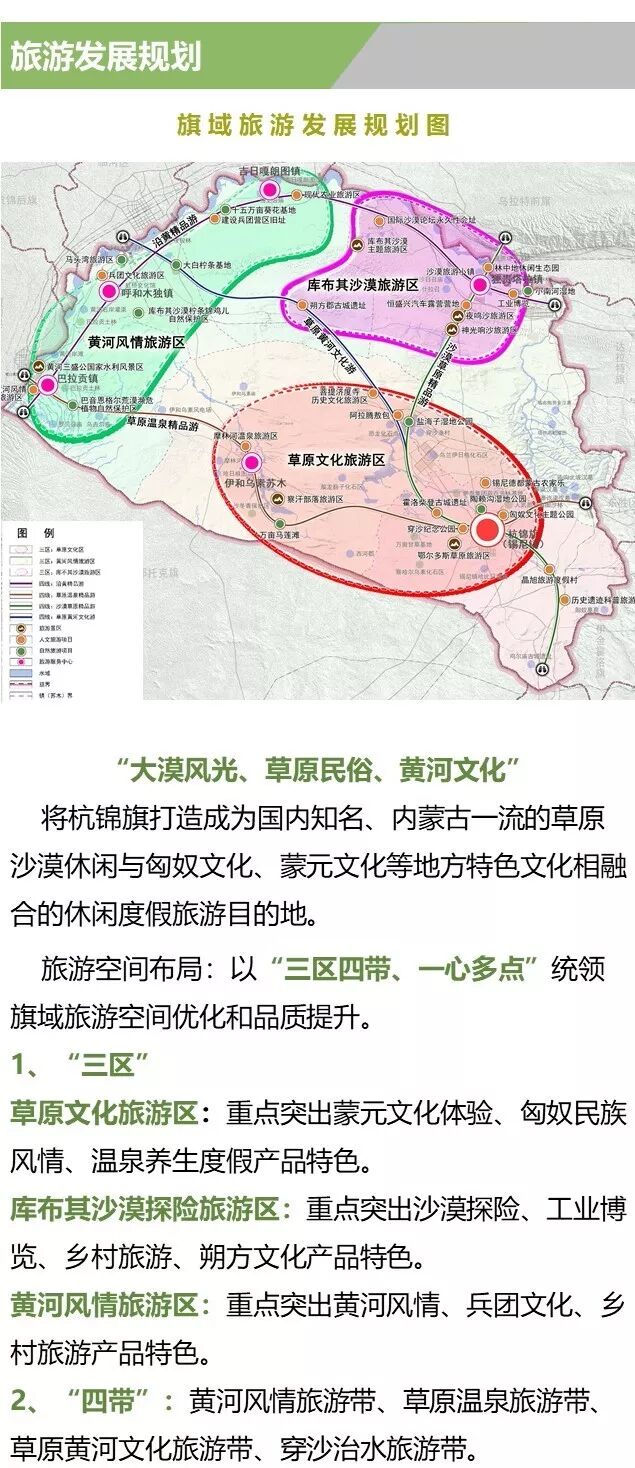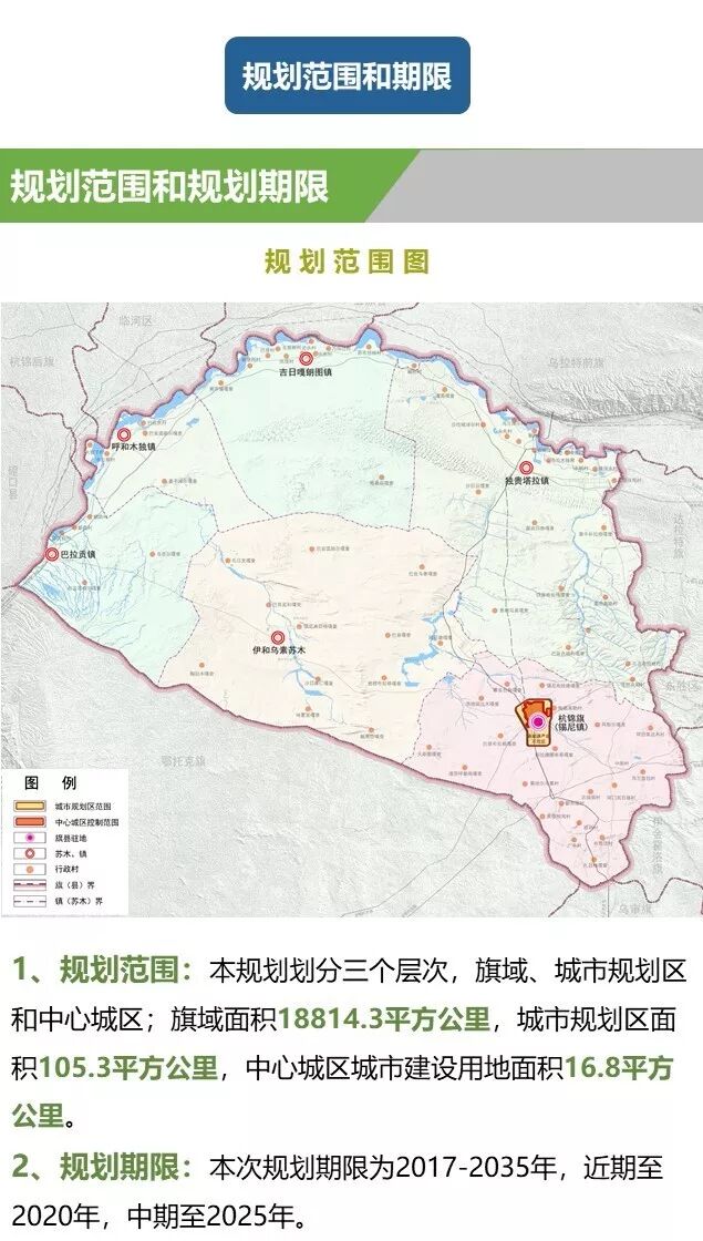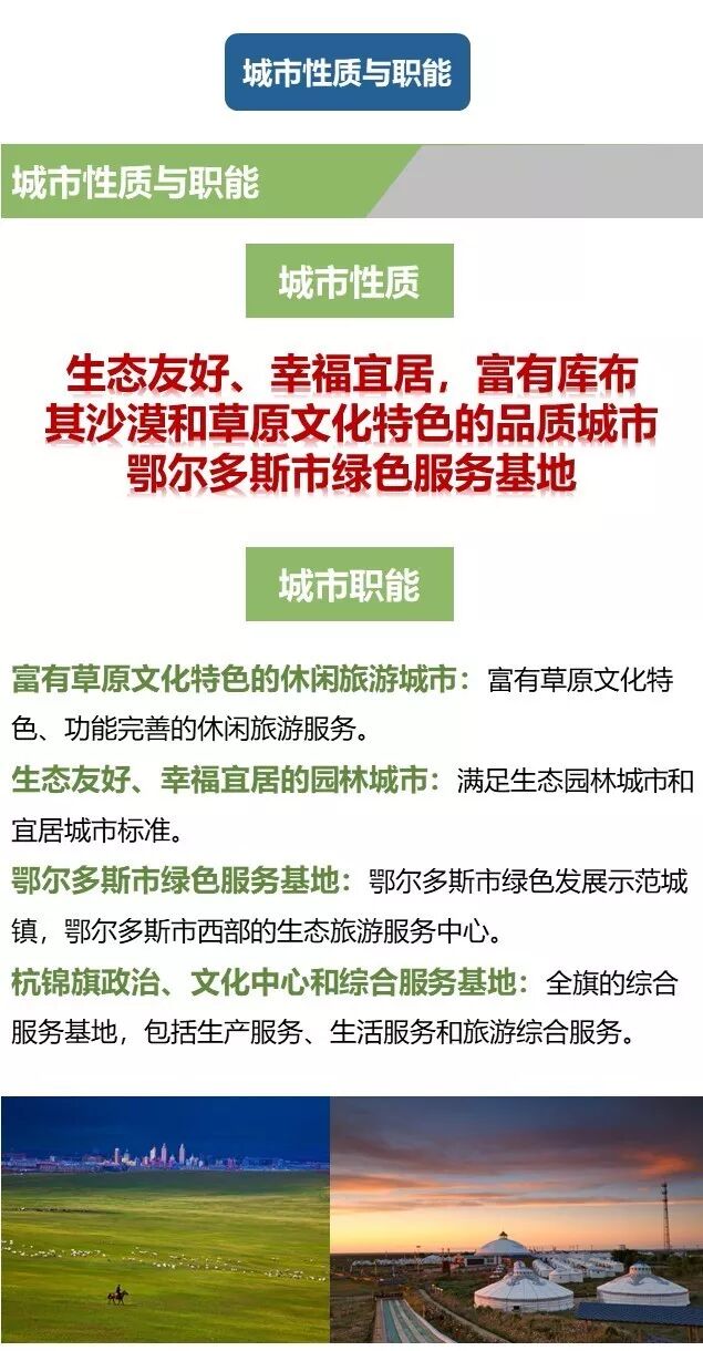 規(guī)劃確定杭錦旗的發(fā)展目標(biāo)為:生態(tài)友好、幸福宜居,富有庫(kù)布其沙漠和草原文化特色的品質(zhì)城市;鄂爾多斯市綠色服務(wù)基地。